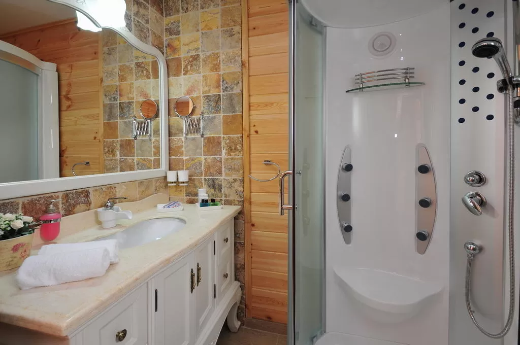 חדר הרחצה כאן מפנק במיוחד. מקלחון ראש גשם זוגי מכיל שני מושבים וג'טים מיוחדים לעיסוי מרגיע. שלל מוצרי טואלטיקה, מגבות, נעלי בית וחלוקי רחצה, ערכות טיפוח ומייבש שיער יהפכו את חווית הרחצה כאן לנעימה אף יותר.