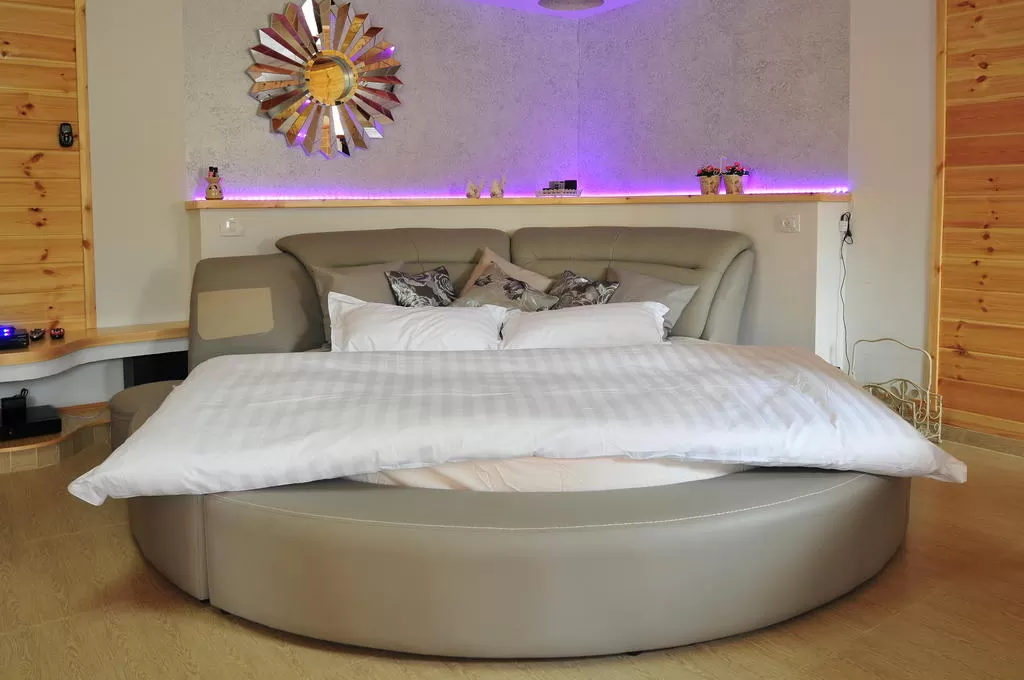 מיטת ענק עגולה תופסת את מרכז החלל. מסביבה – לדים צבעונים, המאירים את מתחם השינה באור רומנטי ונעים. ממול ניצב מסך LCD עם חיבור לכבלים ומערכת קולנוע.