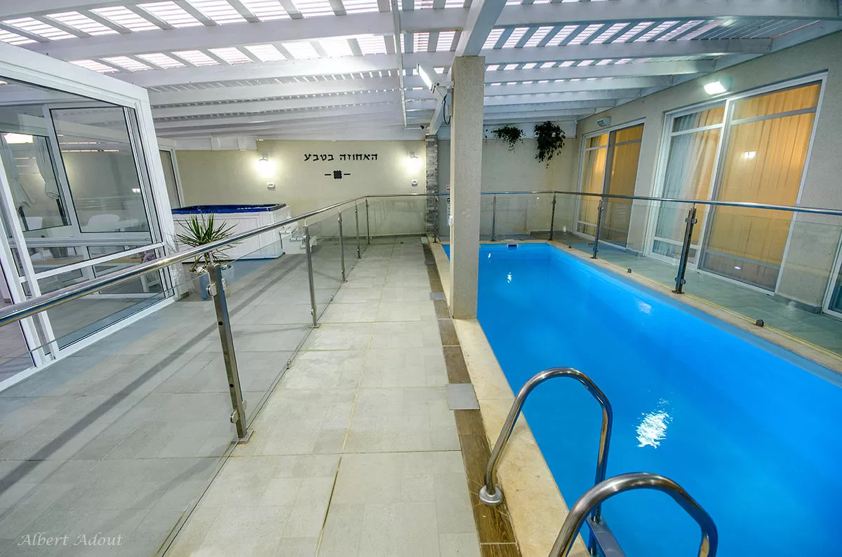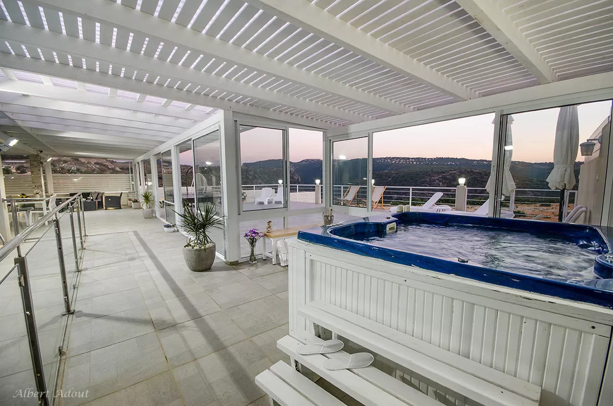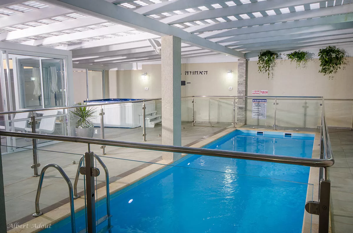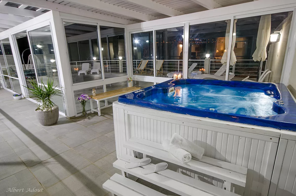 חלקו המקורה של ה"דק" הענק מכיל בריכת שחייה בנויה ומחוממת (8X2.5) בעומק 1.30, ג'קוזי- ספא גדול, שולחן אוכל ופינת ישיבה. הפרטיות כאן מלאה ללא ספק.