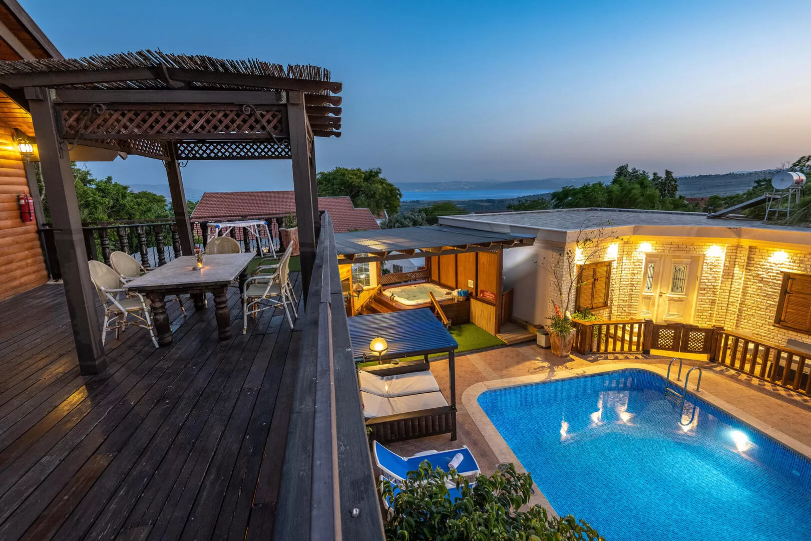 הבריכה המחוממת בנוייה באופן מאוד איכותי ומסביבה יש מיטות שיזוף, נדנדות ושולחן פינג פונג. מעבר לה ממוקם מתחם הספא עם ג'קוזי-ספא גדול, סאונה יבשה שולחן בילארד וחדר טיפולי ספא (ניתן לקבל טיפולים גם בסוויטות).
