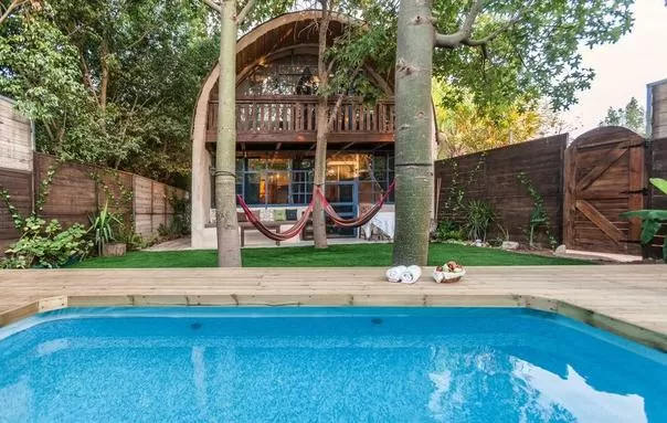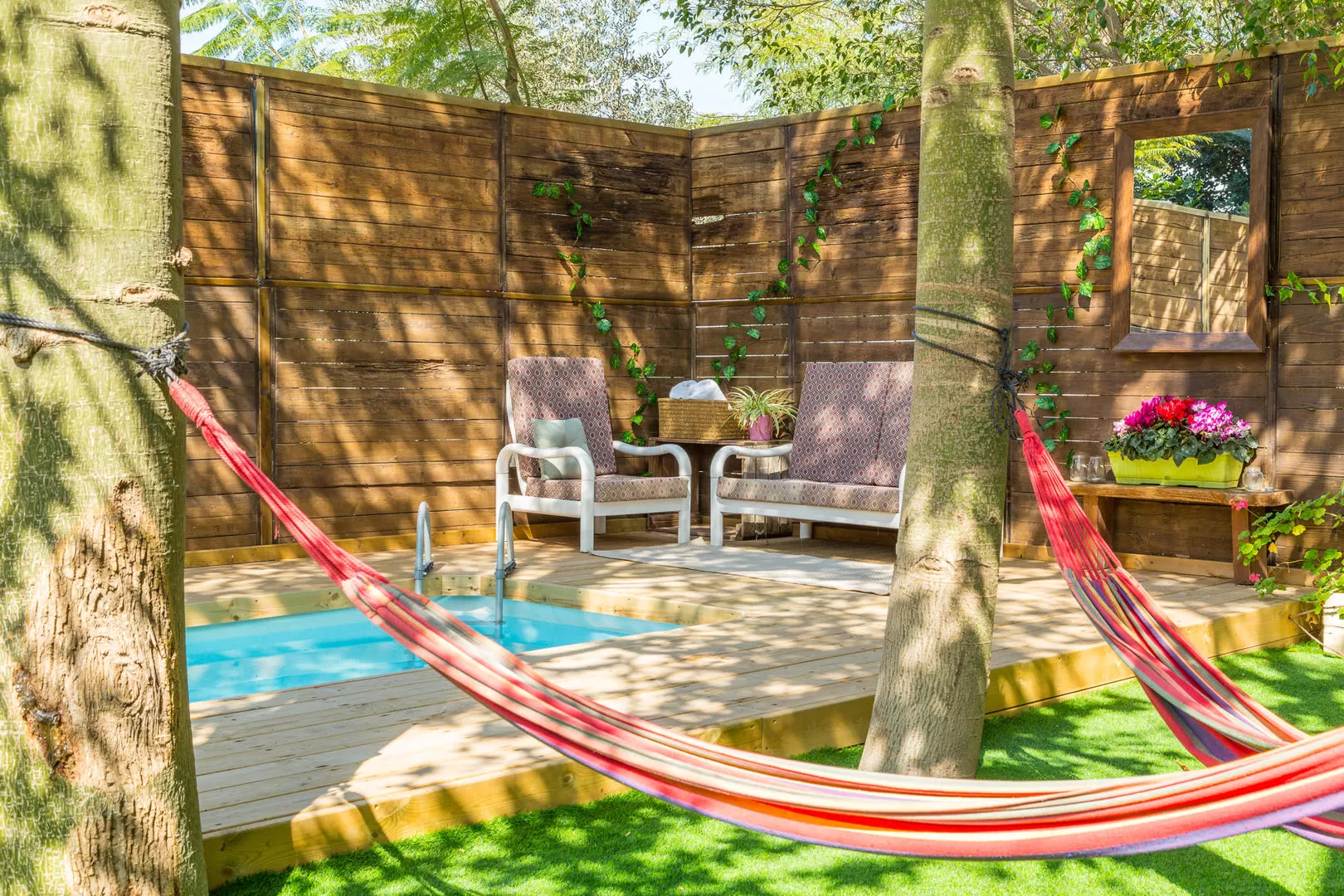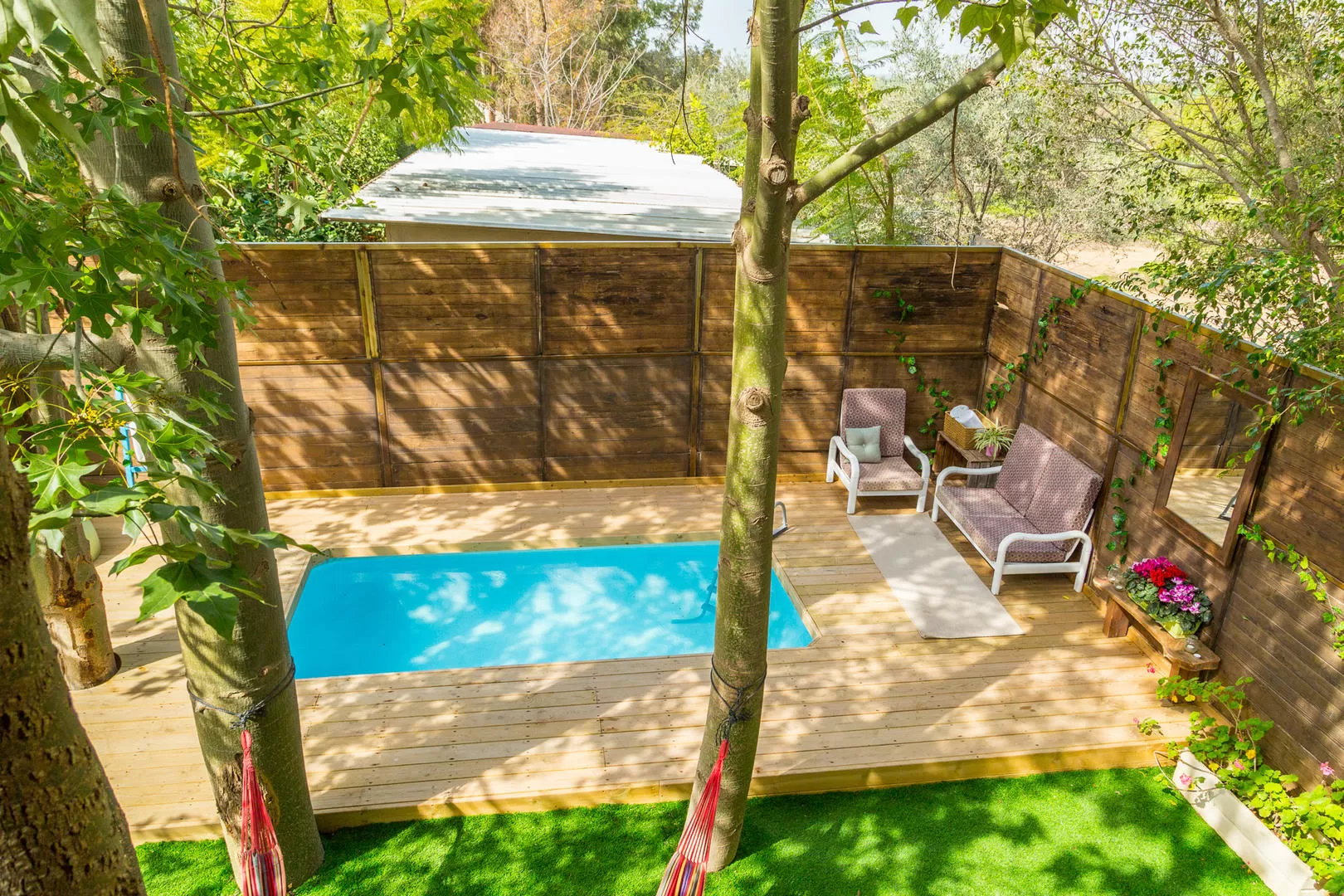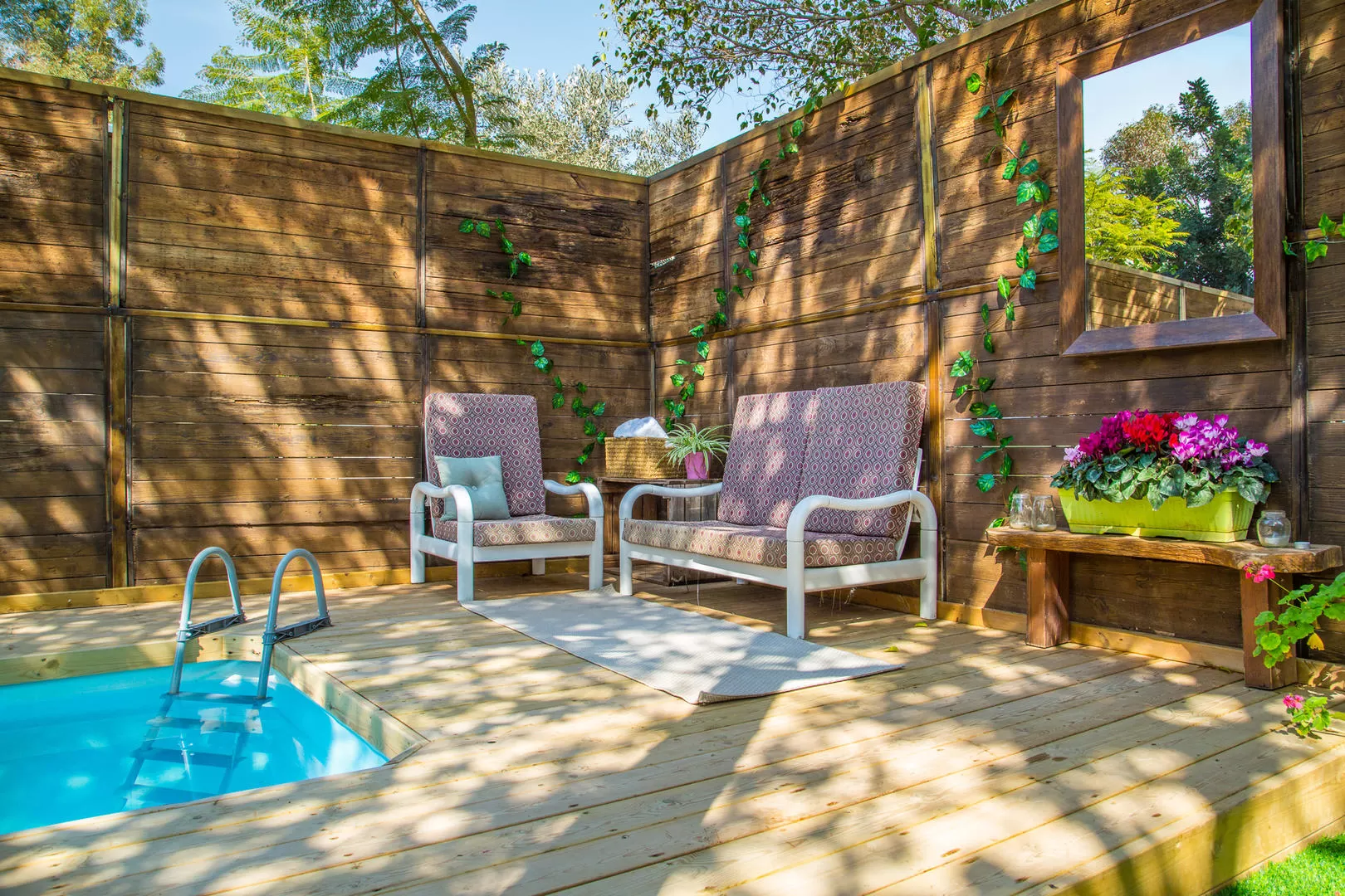 מתחם החוץ מוקף בגדר עץ המאפשרת פרטיות מלאה ובו פינות ישיבה נוחות, ערסלים ובריכת שחייה מחוממת ופרטית (אינטקס).