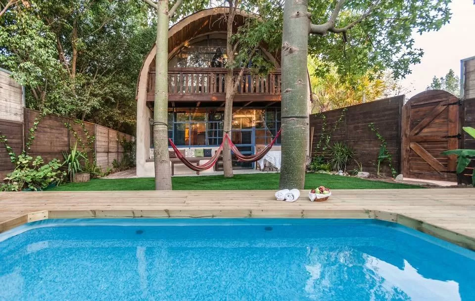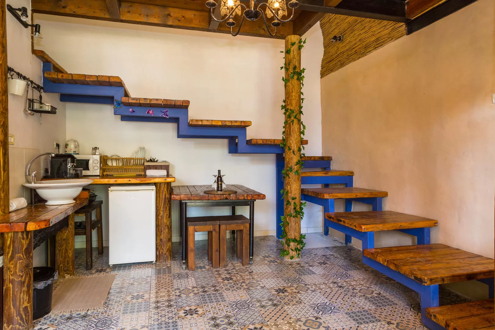המטבח החמוד מכיל מקרר, מכונת קפה, מיקרוגל וכלי אוכל. לצד המטבח בנישה מיוחדת שמזכירה בתי הוביטים יש פינת ישיבה שאפשר לאכול בה. בהמשך נמצאת המיטה המעוטרת בכילה, בצידה ספסל ישיבה נעים, וחדר שירותים נחמד עם דלת עץ.
