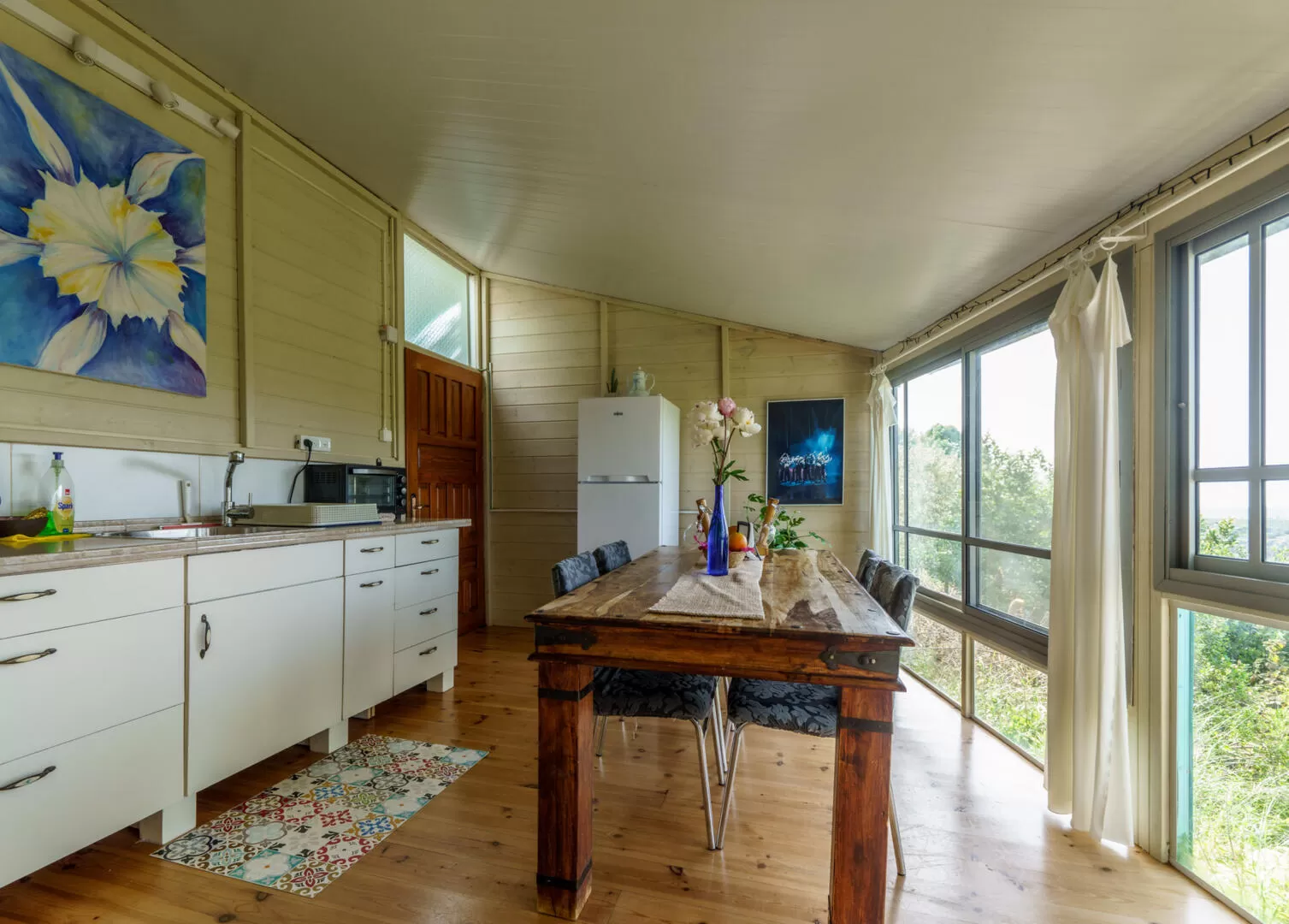 בכניסה לבית יש מטבח מאובזר עם פינת אוכל נפתחת הממוקמת בצידו של חלון הצופה לנוף פתוח, וסלון נעים ומרווח המאפשר מרחב נעים לשהייה משפחתית משותפת על הספה הנוחה, אל מול הנוף הנשקף מהחלונות הבלגיים הגדולים שיש כאן. הנוף מגיע עד הים, וכל מה שנשאר זה למזוג כוס של יין ולהנות מכל היופי המלבב הזה. לאוהבי הקפה, יחכה לכם כאן קפה שחור טחון טרי המיועד למקינטה. אם הגעתם לכאן בחורף, תוכלו ליהנות מקמין עצים אותנטי. במתחם מותקנת מערכת של "מים חיים" הן לשתיה והן לרחצה, שמטהרת את המים ומיטיבה עמם.
