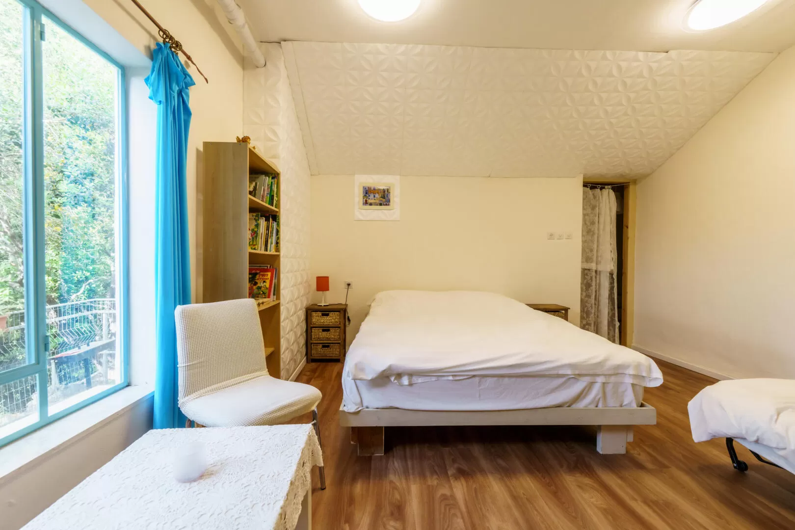 בחדרים שורה אווירה נעימה, והם כוללים מיטה זוגית רחבה ונוחה עם מצעים רכים, שידת מגירות ומקום לאחסון. שני חדרים הם מרווחים יותר. אחד החדרים מלא באור טבעי שנכנס מבעד לחלונותיו הגדולים, דרכם משתקף נוף יפהפה לואדי, לים ולמבצר המונפורט. משני החדרים הנוספים ניתן לתצפת לחורש האלונים. שלושת חדרי השינה חולקים חדר רחצה ושירותים אחד.