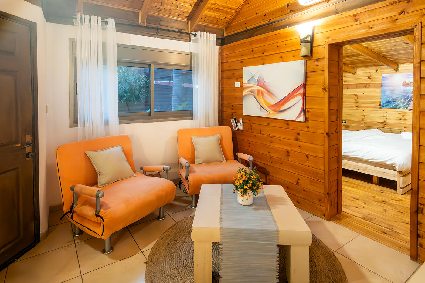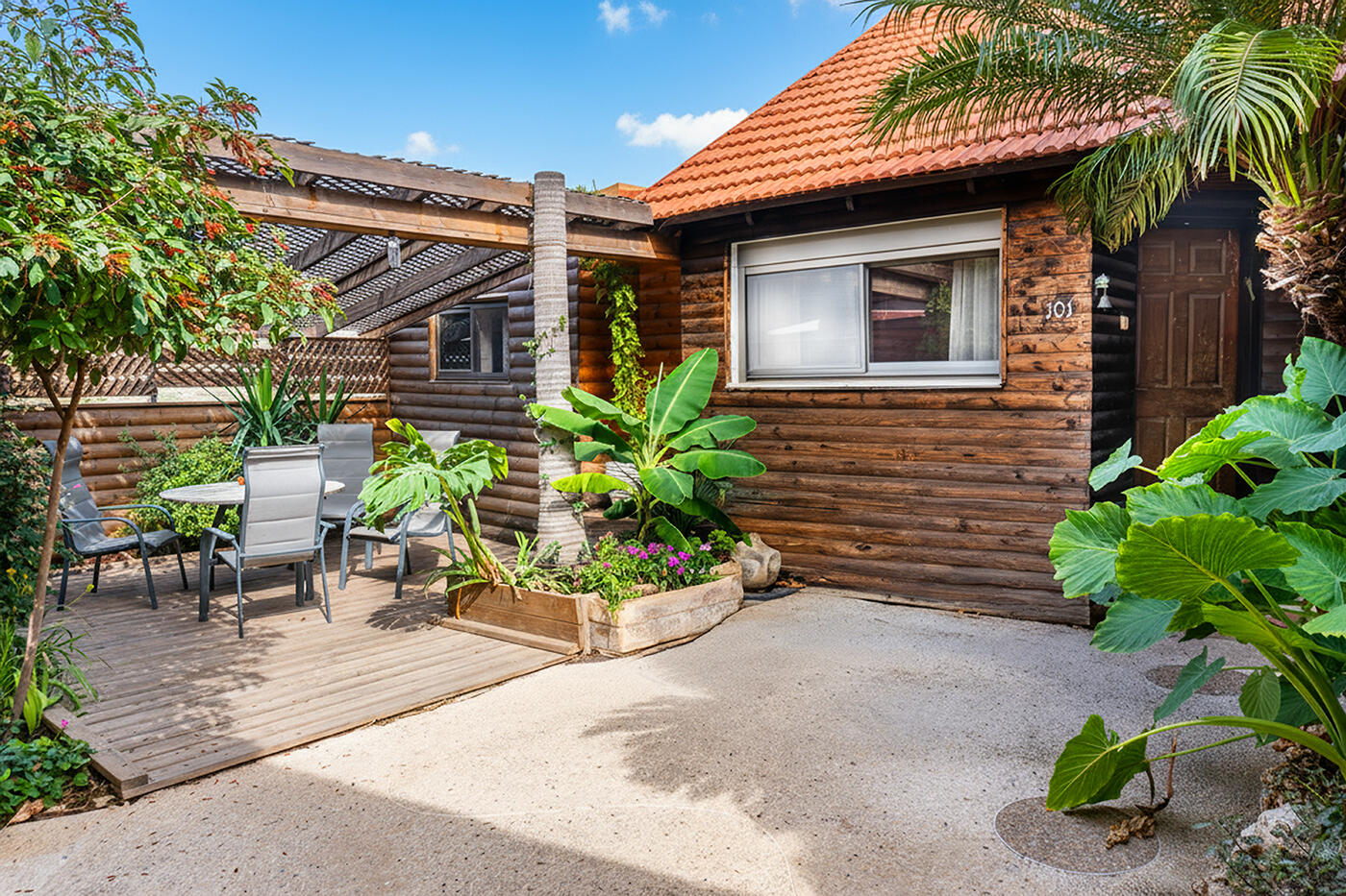 בקתה מספר 101 - בקתה משפחתית חמודה ואינטימית המחולקת לשני מבנים שבכל אחד מהם חדר שינה זוגי.