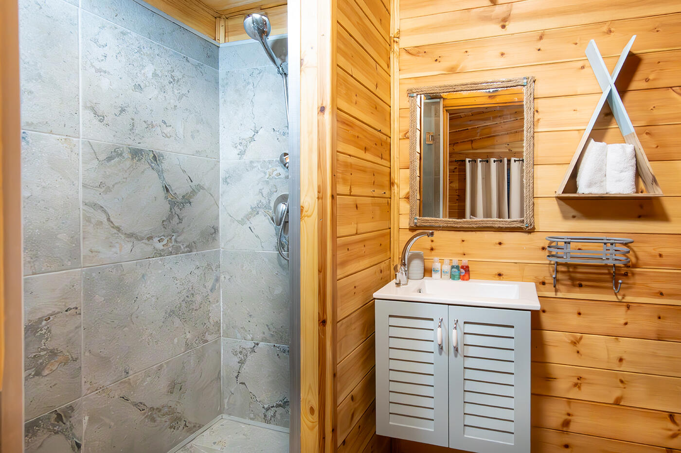 המבנה השני מכיל חדר שינה עם מיטה זוגית וחדר רחצה פרטי משלו. אזור ישיבה נעים יחכה לכם בכניסה.