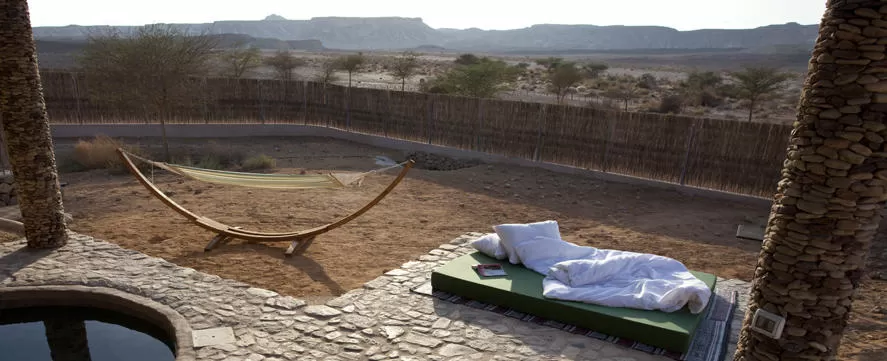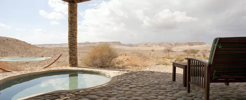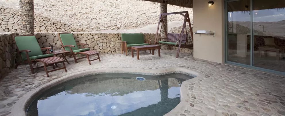 הסלון נפתח אל מרפסת עם בריכת טבילה (מחוממת ומקורה) ו"דק" המצוייד במזרוני רביצה, בו ניתן לצפות הרחק אל הנוף המדברי המרהיב. לא קל לבחור כאן היכן לשהות...