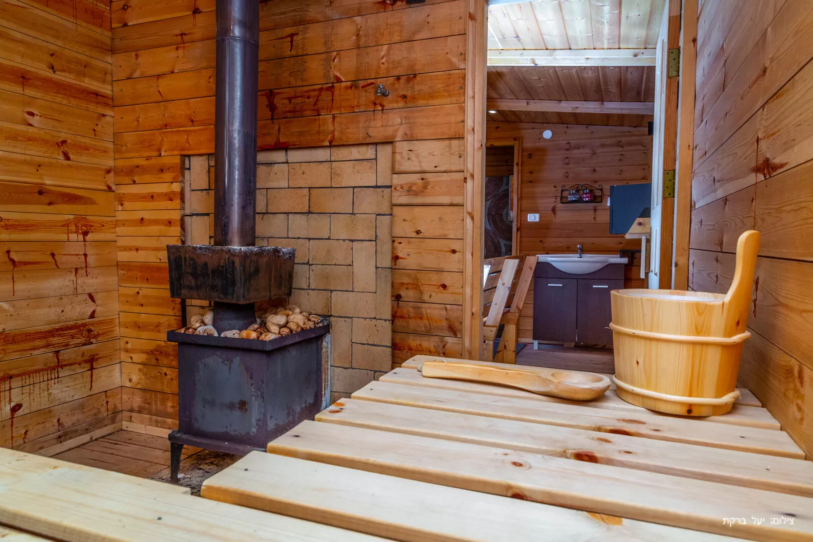 - סאונה יבשה סאונה פינית גדולה המתאימה ל-8 אורחים ופועלת על הסקת עצים