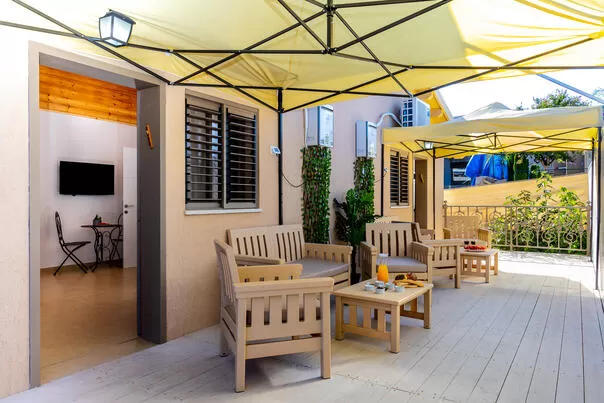 - מרפסת צמודה מקורה עם פינת ישיבה מחוץ לסוויטה