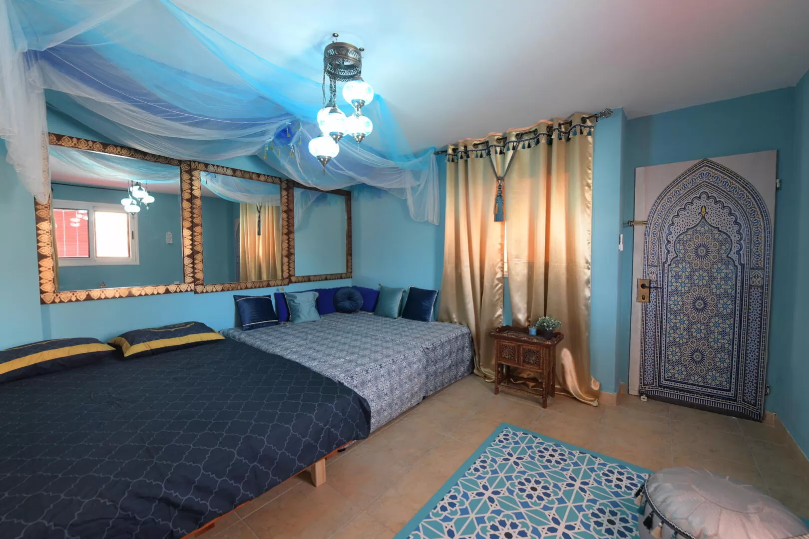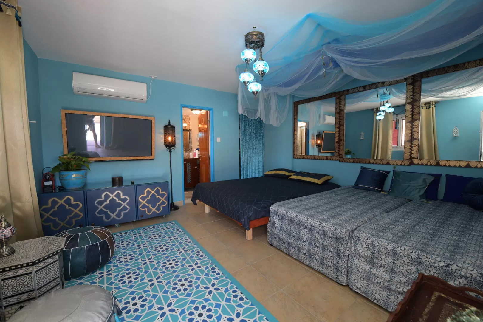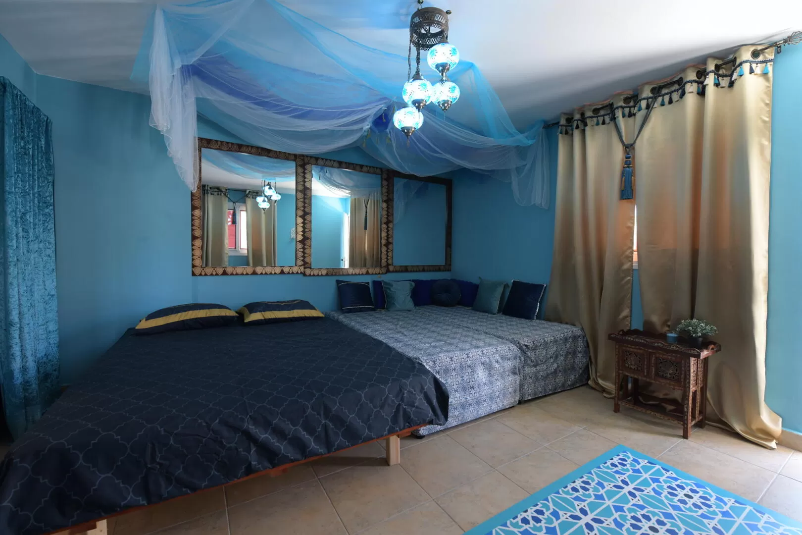 הצימר המרוקאי שופע צבעוניות אותנטית. הקירות שצבועים בתכלת עמוק מוסיפים המון אופי לחלל ומתמזגים מעולה בעיצוב הכללי. יש בו מרחב שינה ורביצה גדול ומזמין, פופים קטנים וכריות צבעוניות מוסיפים נינוחות למרחב, והאהילים המרוקאים היפים פוגשים אותנו גם כאן וגם בחדר הרחצה המעוצב היטב, עם ראש גשם גדול ומפנק. בקיצור, כשמרוקו פגשה את אילת זה כאן.