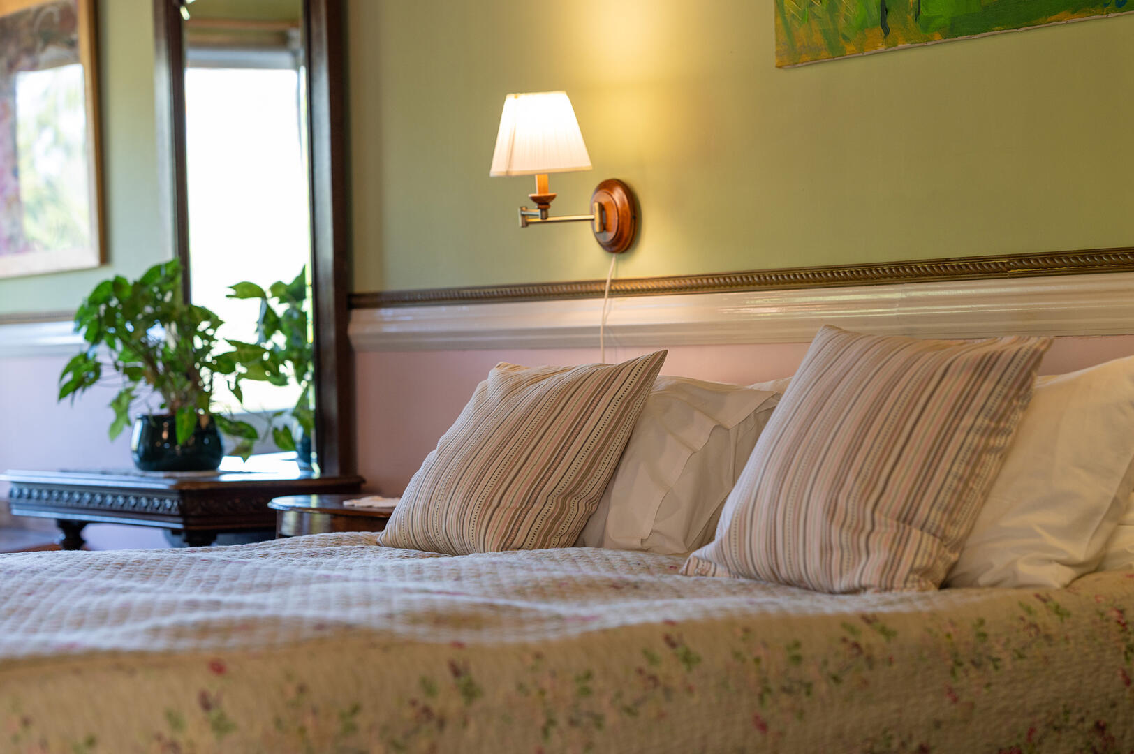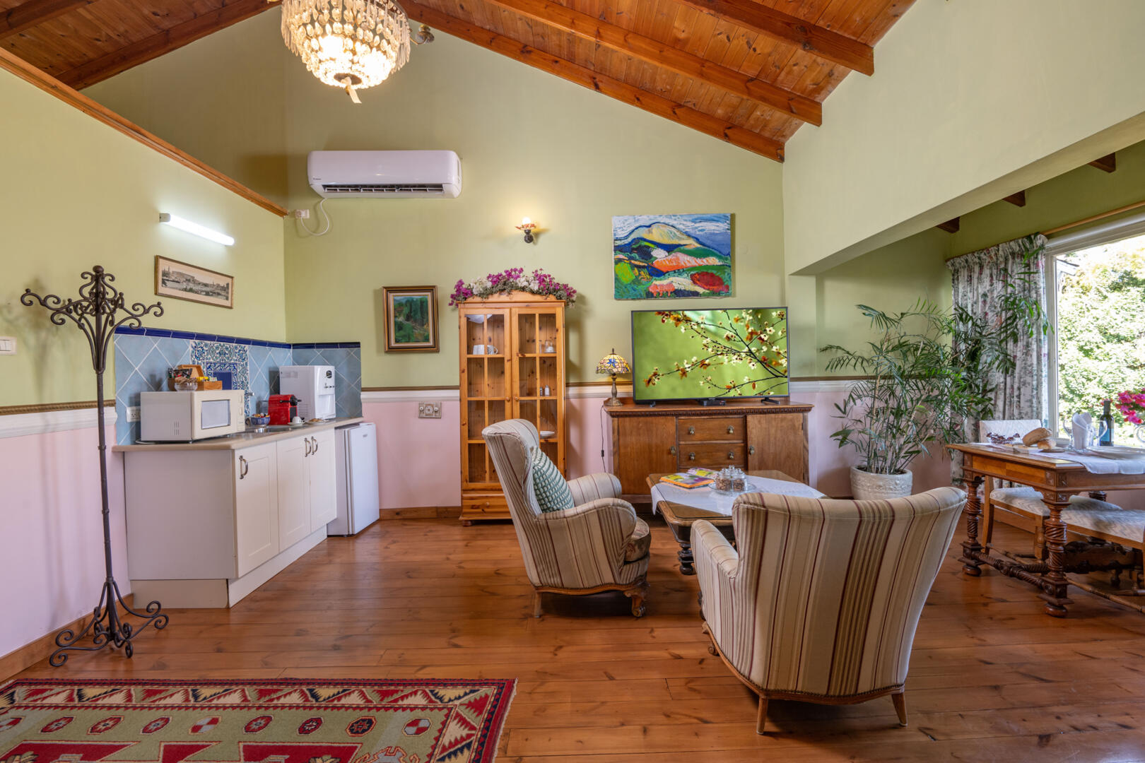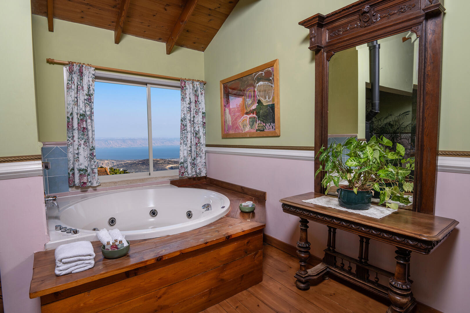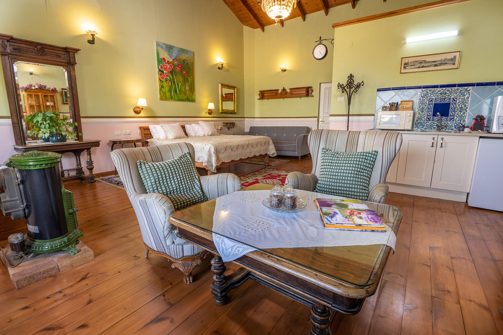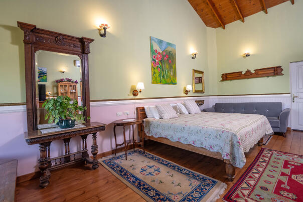 הסוויטה הגדולה מהווה חלל רחב ידיים (60 מ"ר) ומואר היטב בזכות החלונות הגדולים. הגוונים בחלל עשויים בפלטת צבעים של ירוק-ורוד עתיק - שילוב מפתיע ומעניין, אשר מעניק למקום תחושה של תחכום אלגנטי ורומנטיקה מעודנת.