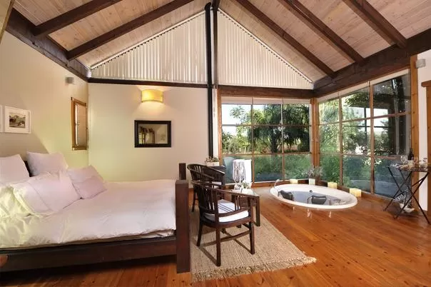 ג'קוזי שקוע ברצפה ממוקם בפינה מול שני קירות חלון ענקיים שמכניסים את הגינה פנימה (לא לדאוג, וילונות ההחשכה טובים). אני יוצא ומרגיש את שמש יוני מעלה הילוך. מזל שיש בריכה. היא גדולה ויפה, מוקפת "דק" ופינות ישיבה, וצופה אל מטע הזיתים הצמוד והשדות.
