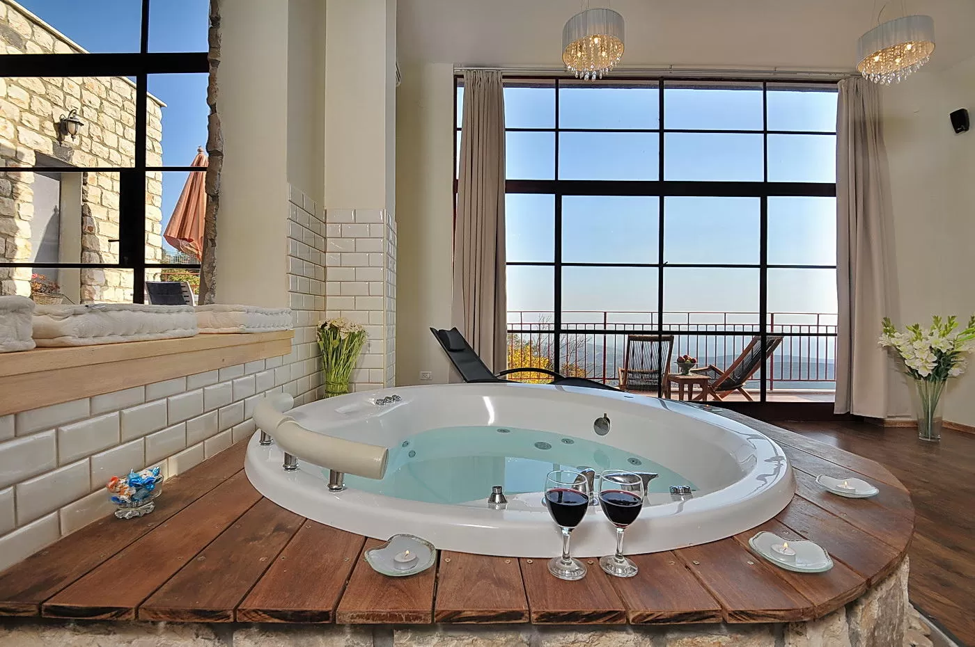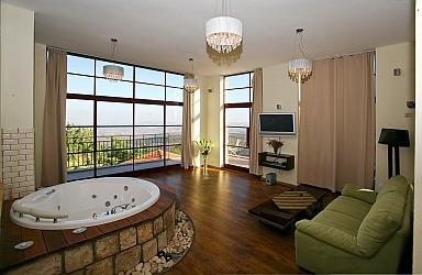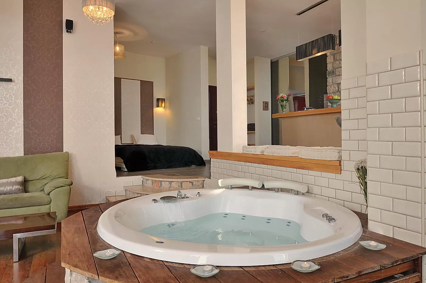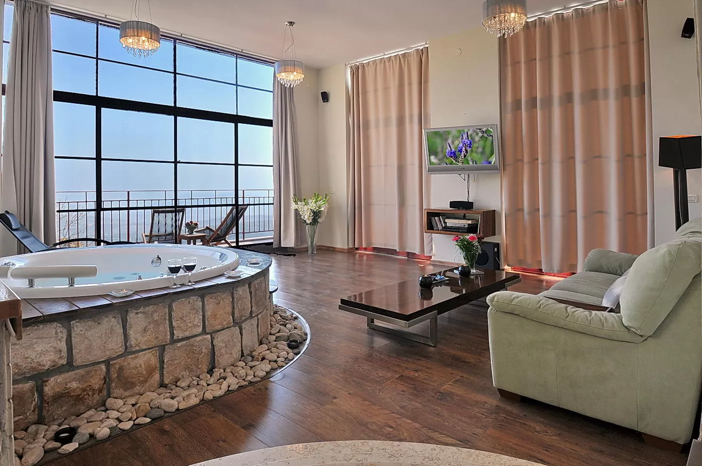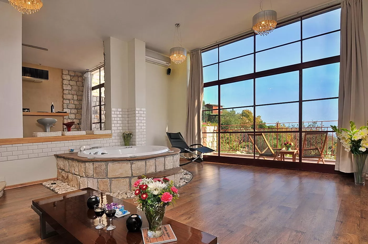 בחלקו הנמוך והרחב יותר של הלופט, ניתן למצוא את חלל הסלון, שרצפתו פרקט, ובו נמצא הג'קוזי המלכותי בעל התאורה הפנימית, שדפנותיו עשויות קורות עץ, ותחתיו טבעת רחבה בה פזורים חלוקי נחל ונרות.