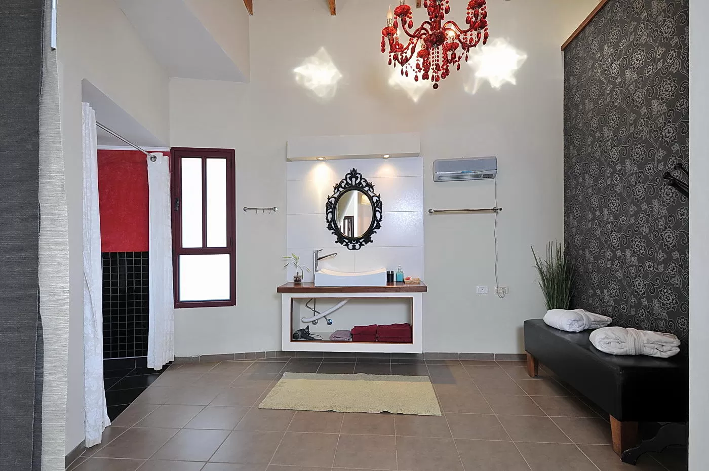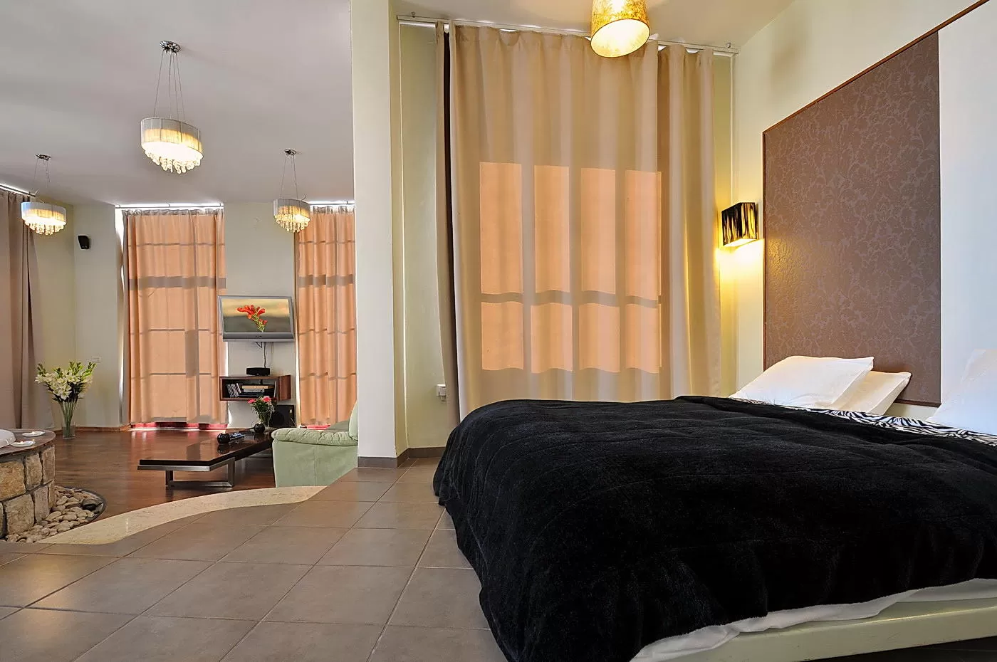 לכשתרצו לנוח או להאריך את שעות החשכה הרומנטיות, תוכלו לסגור את וילונות ההאפלה הענקיים הפזורים בחדר, ולהעצים את החוויה הזוגית באמצעות משחקי התאורה הנפלאים, הפזורים ברחבי החלל.