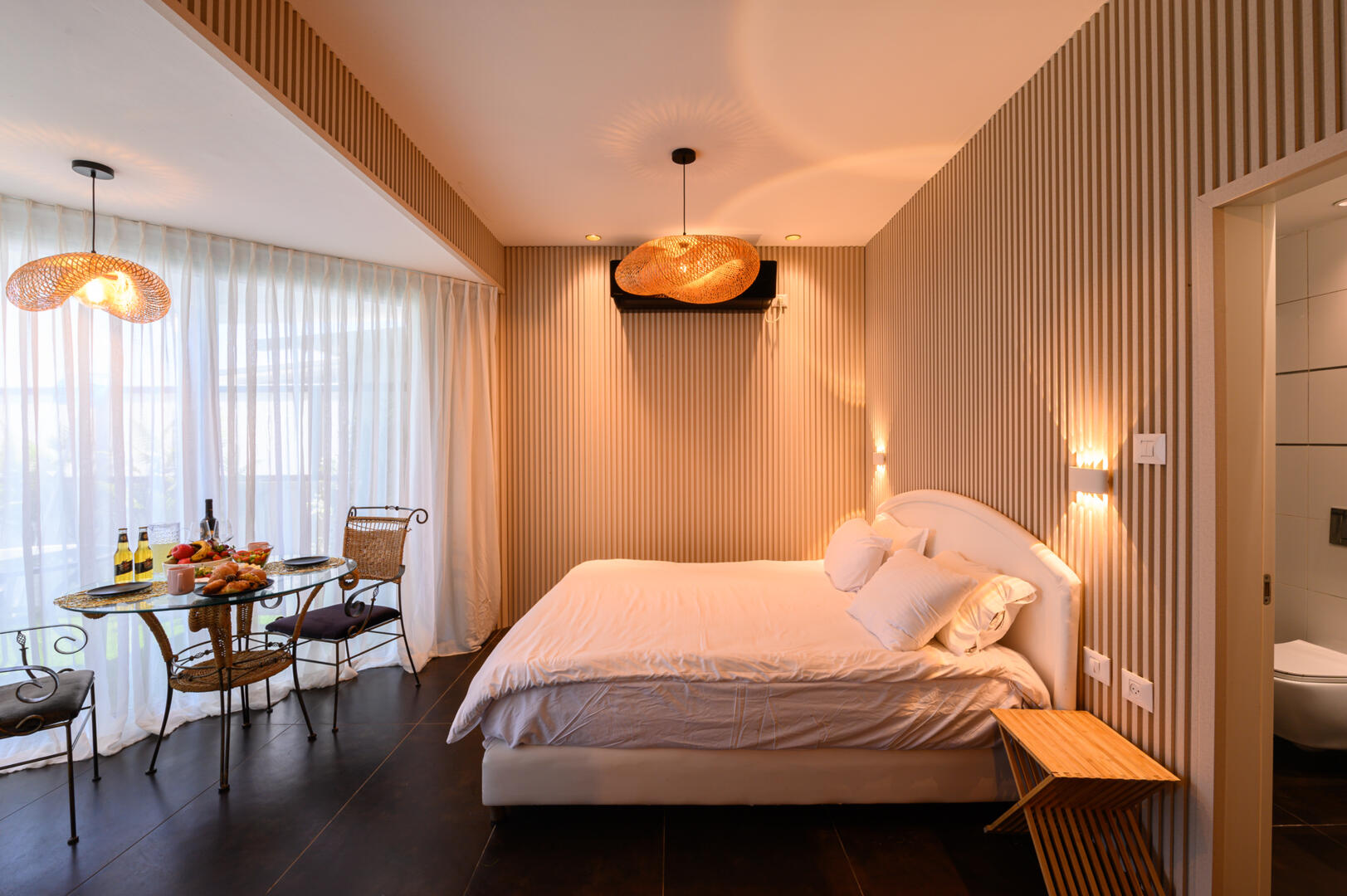 אז נכון, עיצוב הפנים כאן אינו אחיד, אבל יש לכך סיבה טובה: מדובר בבית המגורים לשעבר של המארח שחלקו העליון שודרג לאירוח זוגות. התוצאה: שילוב של חמימות בייתית, ריהוט נוח, עם תחושת גודל ותכנון "נכון" שפותח את המבנה לבריכה ולנוף.