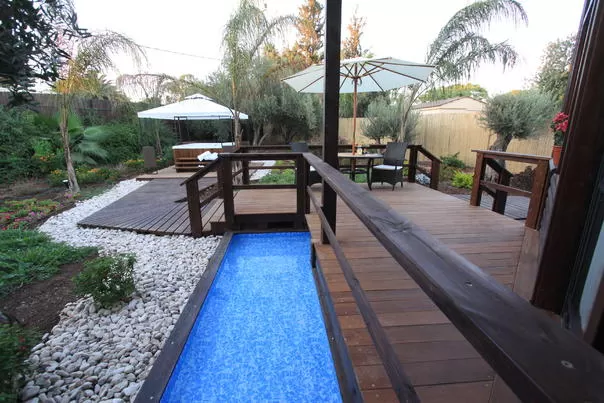 מחוץ לבקתה יש גן יפה, פרטי לגמרי, שבמרכזו ג'קוזי ספא מקורה. 'יש עוד שתי בקתות כאלה' עמית אומרת, ואני מנסה להבין איפה הן מסתתרות. אחרי שמצאתי אותן אני משוכנע שזהו, אבל עמית מובילה מעבר לעיקול השביל ו...וואו! מה זה הבריכה הזאת?!? ב"דק" עץ ענק מוקף צמחייה בנויה בריכה שאם לא הייתי רואה אותה הייתי בטוח שזאת סתם עבודת פוטושופ טובה. 'אין אצלנו ארוחות בוקר בבקתה' עמית אומרת, אבל זה פתאום נראה לי ממש לא חשוב....