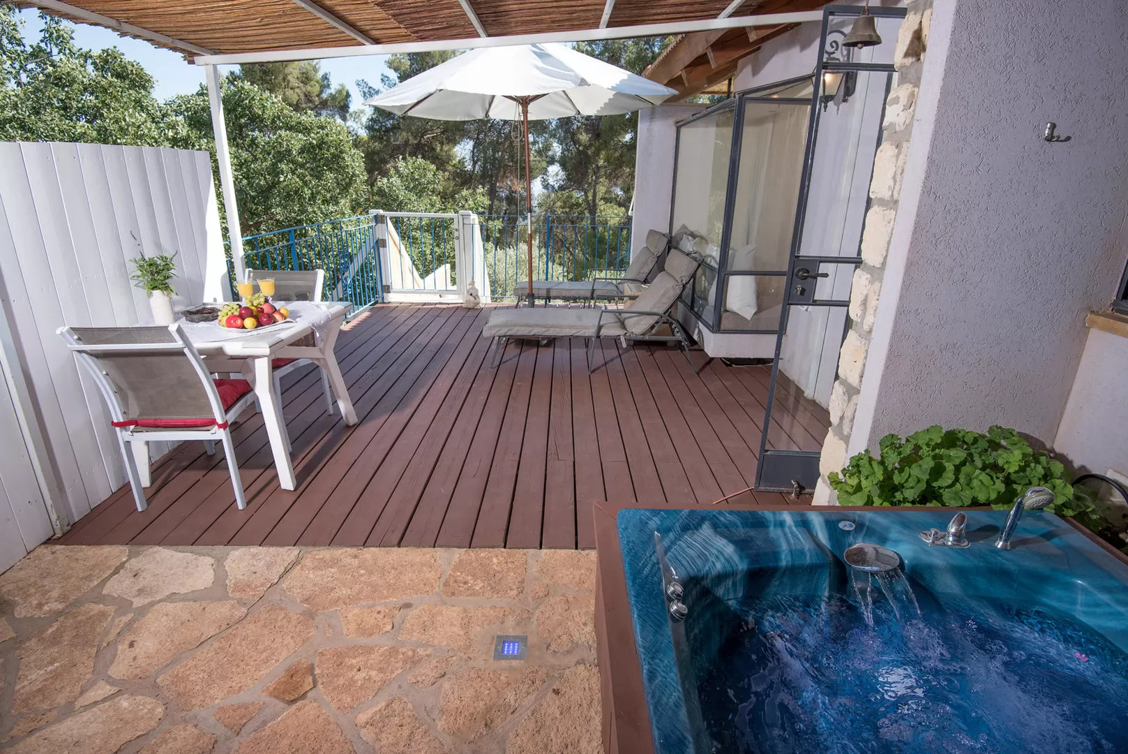 ג'קוזי גדול מסתתר לו בפינה מבודדת במיוחד. חשוב לציין כי הג'קוזי החיצוני הוא מהסוג הרגיל- דהיינו יש למלא במים חמים בכל רחצה. ואם הגעתם לכאן בימי הקיץ החמים - אל תשכחו להפעיל את המקלחון החיצוני הניצב בסמוך תחת כיפת השמים.