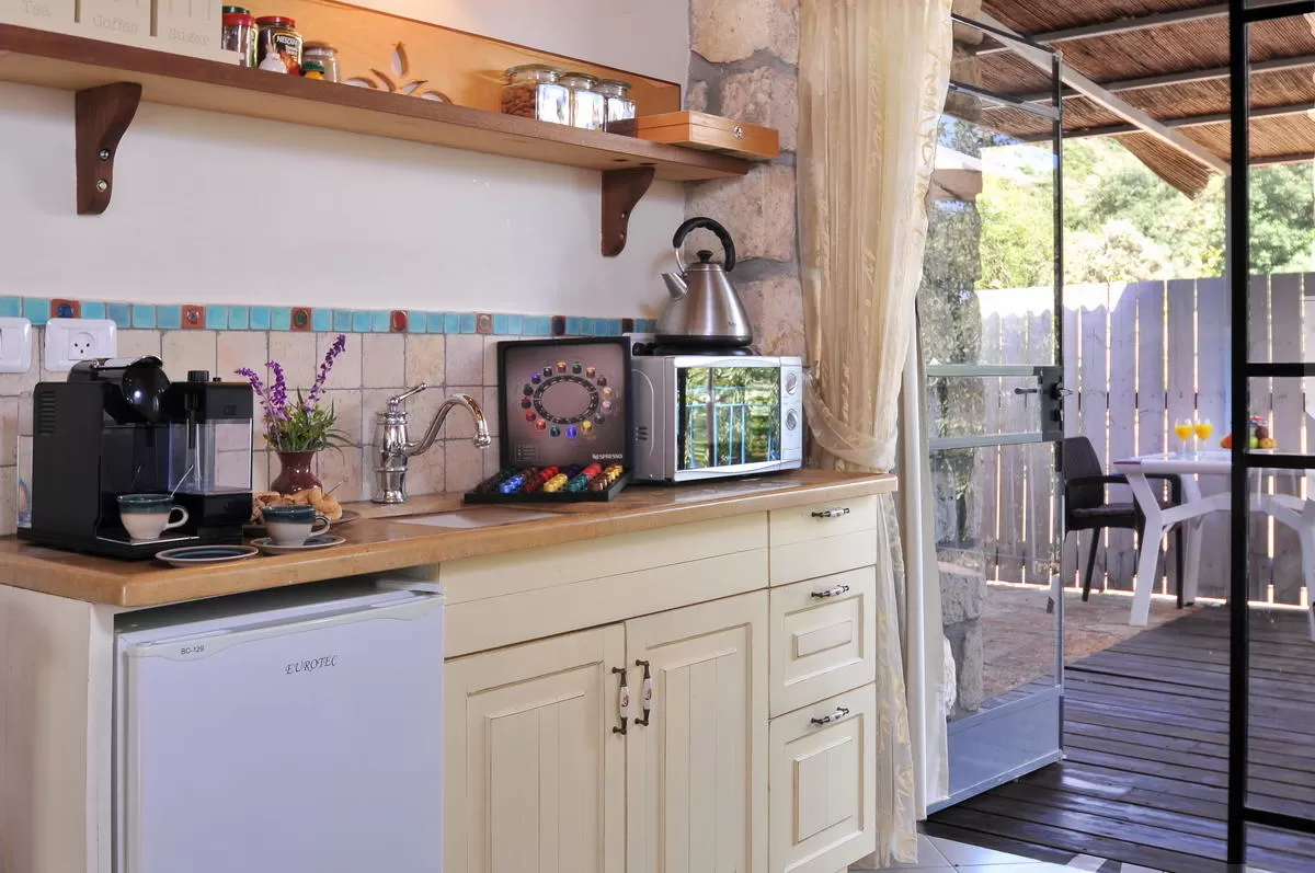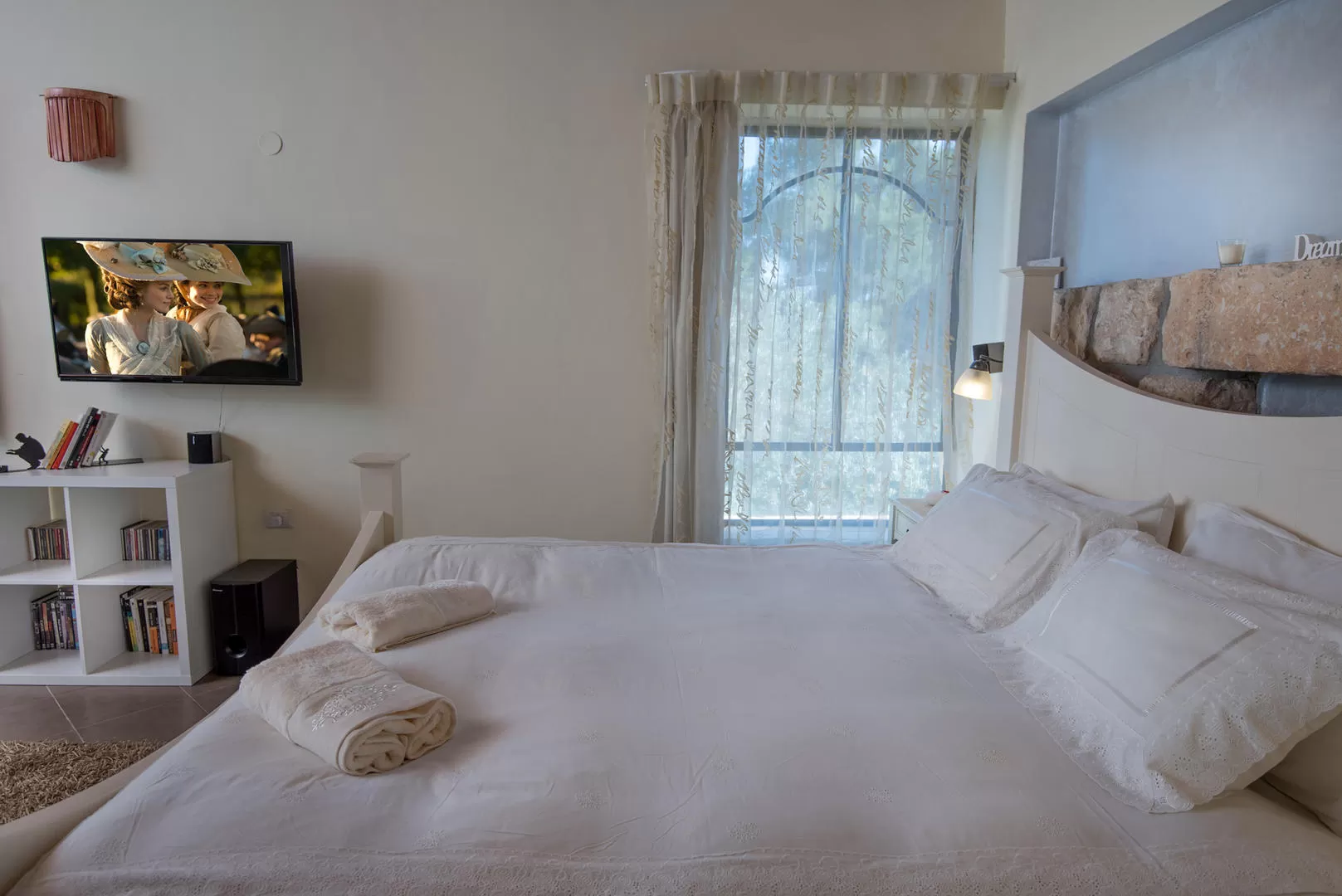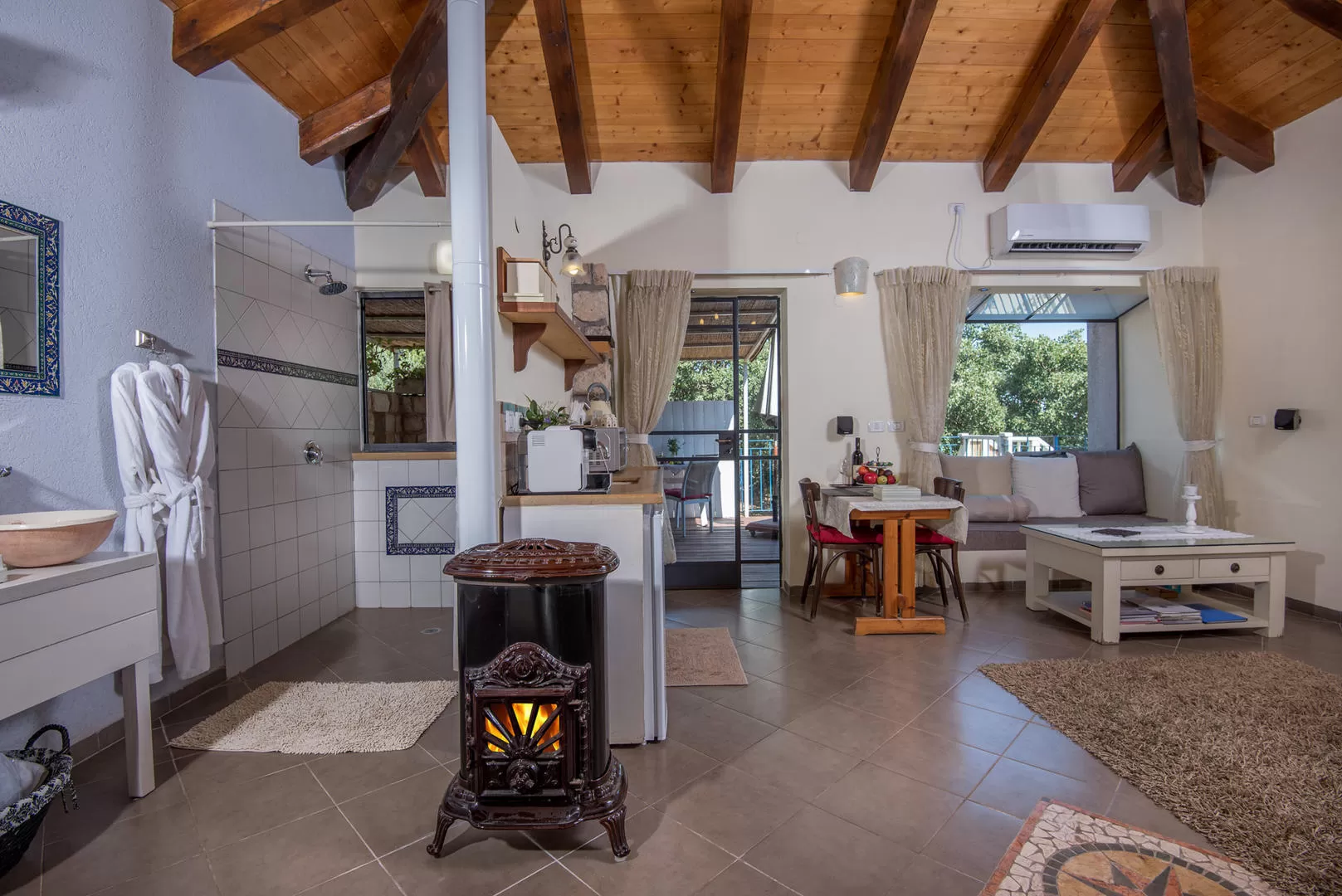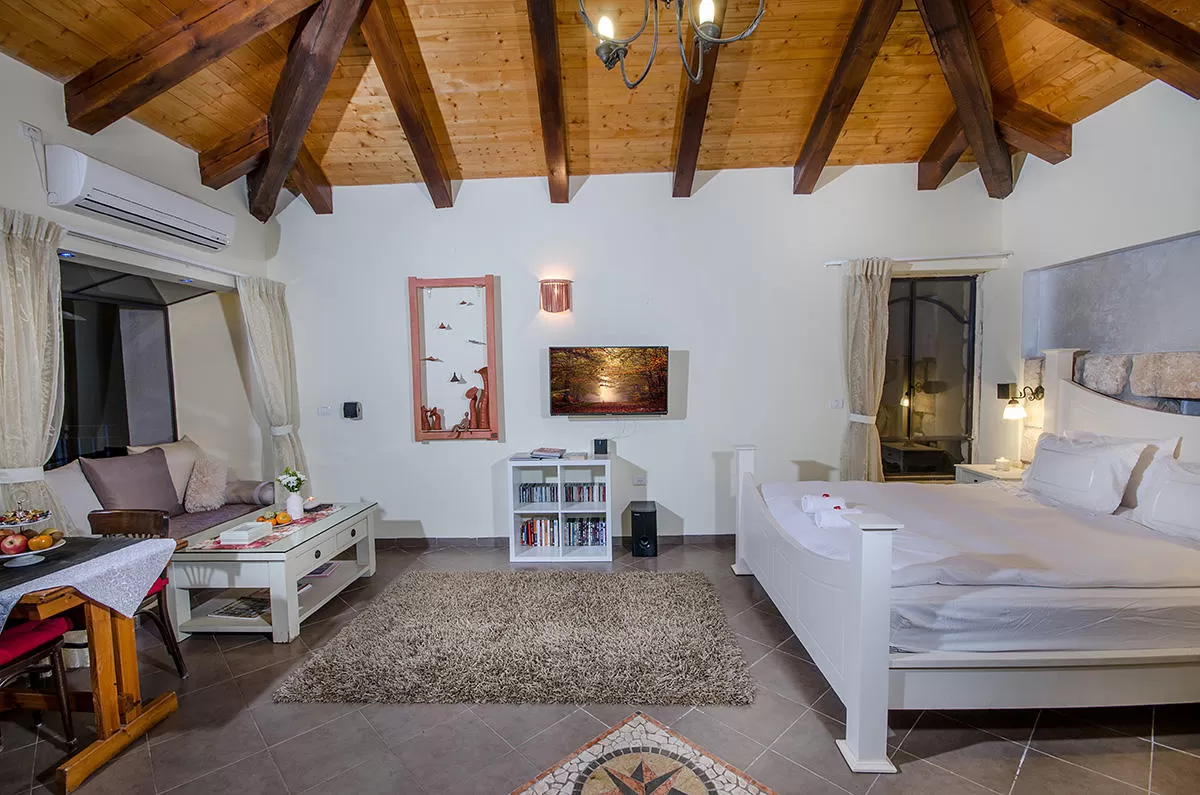 מיטת עץ לבנה מתהדרת במידת ענק "קינג סייז" ומבוססת על מזרן "קינג קויל" איכותי. המטבחון הכפרי מעוצב ומציע ציוד משובח וחדר הרחצה טומן בתוכו מספר הפתעות נעימות במיוחד: יש כאן זוג כיורי חרס בעבודת יד, ומעליהם ברזי מפל מיוחדים. במקלחת שני ראשי גשם גדולים הניצבים אחד מול השני ובצידם חלון זכוכית חלבית, המזרים אור מחמיא ומרענן.
