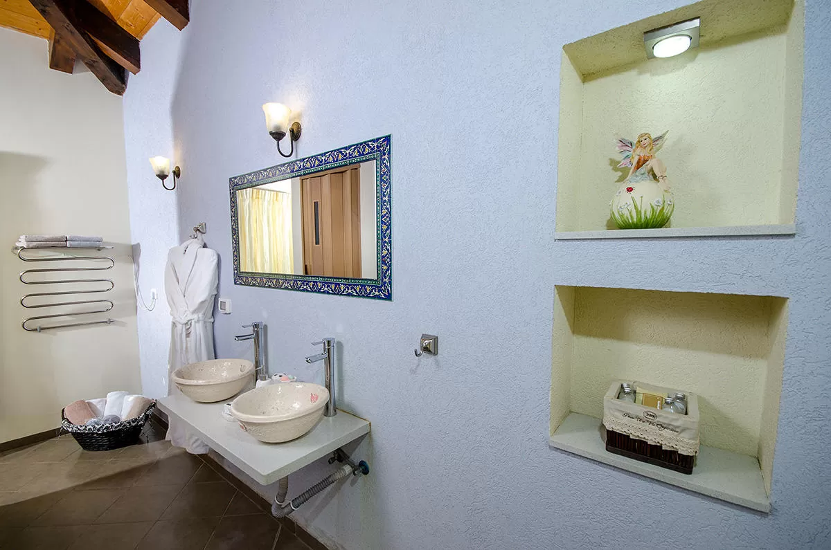 "הסוויטה הלבנה" בנויה כחלל פתוח, מרווח ומואר היטב. בניית אבן משולבת כאן עם אלמנטים מעץ, העשויים בנגרות כפרית. פלטת צבעים בגווני לבן – שמנת מעניקה לחלל תחושה קלה, רכה ומעודנת. החלל שופע פתרונות עיצוב ייחודיים אשר יוצרים כאן מראה רענן ולא שגרתי. הסוויטה עשירה במגוון דקורציות מרהיבות : עבודות פסיפס מקוריות, מוזאיקה וויטראז', אריחים אותנטיים ותמונות קיר מקוריות.